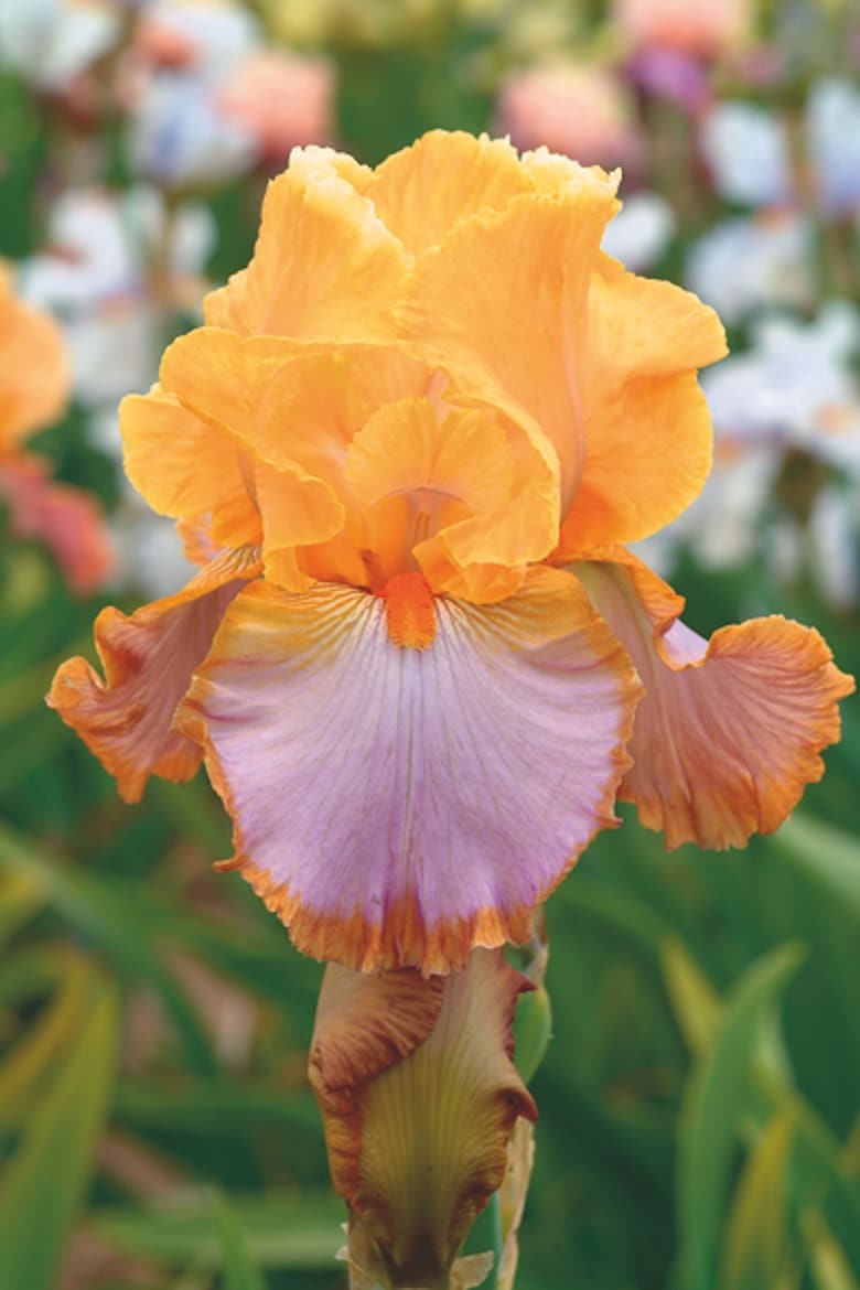 Les pétales brillants abricots contrastent avec ses sépales violet lavande pâle, élégamment ornées de barbe mandarine et d’un bord d’abricot foncé à leurs extrémités.