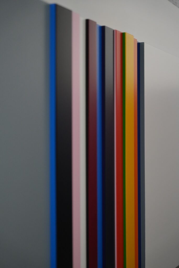 Au cœur de cette exposition, le groupe d’œuvres Spektrum capte immédiatement le regard. Ces grandes compositions en bois, composées d’éléments assemblés un à un, deviennent de véritables supports d’images. Les superpositions et les décalages des pièces, sur plusieurs plans verticaux et horizontaux, génèrent des espaces nouveaux qui révèlent la couleur sous un angle inédit.