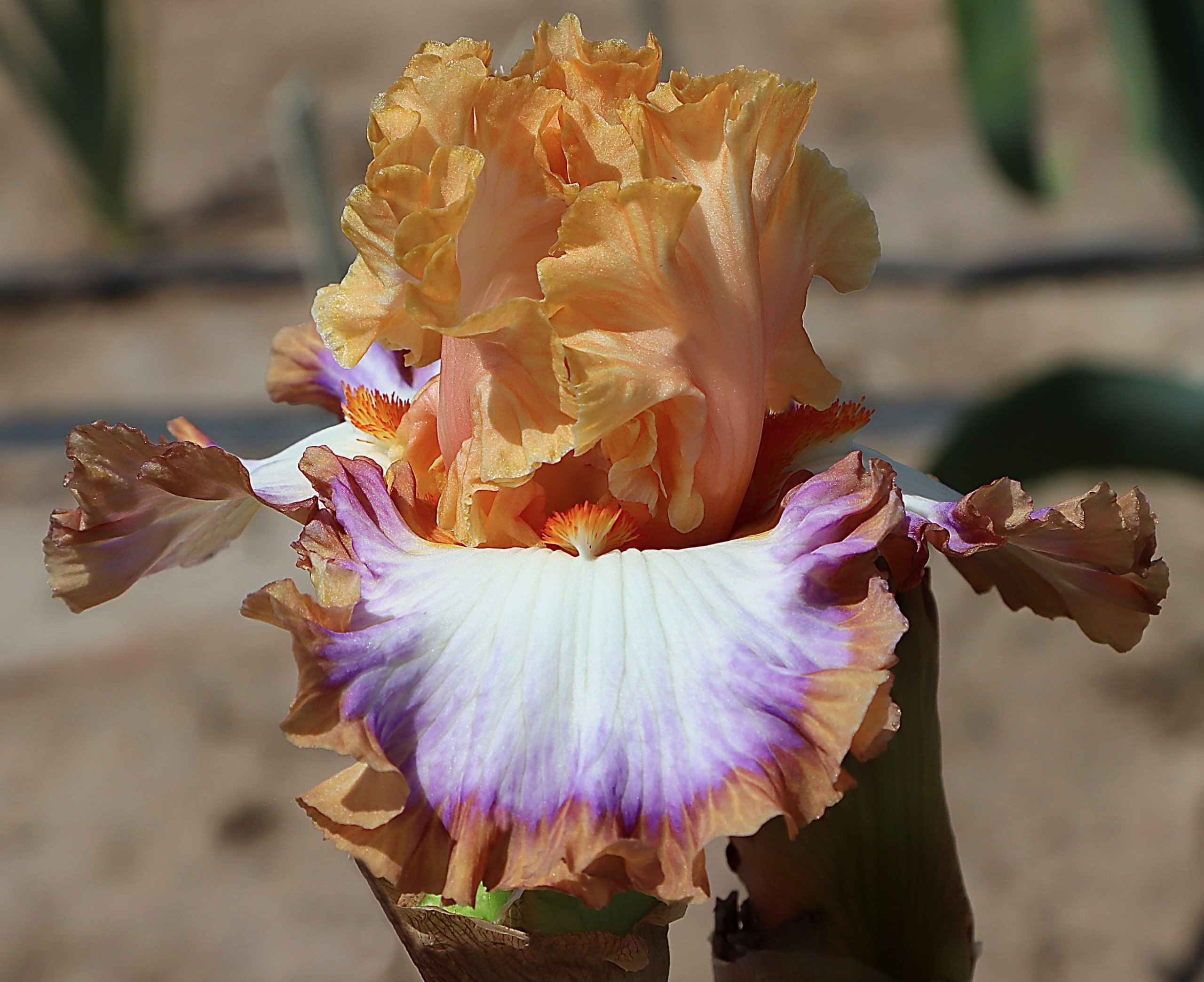 Comme une œuvre d’art tirée d’un livre à colorier, ses pétales abricot et sépales blancs sont rehaussés d’une large bande lilas tachetée, suivie d’un abricot cannelle rayé. Chaque nuance s’entrelace dans une explosion de couleurs spectaculaires, une beauté sucrée