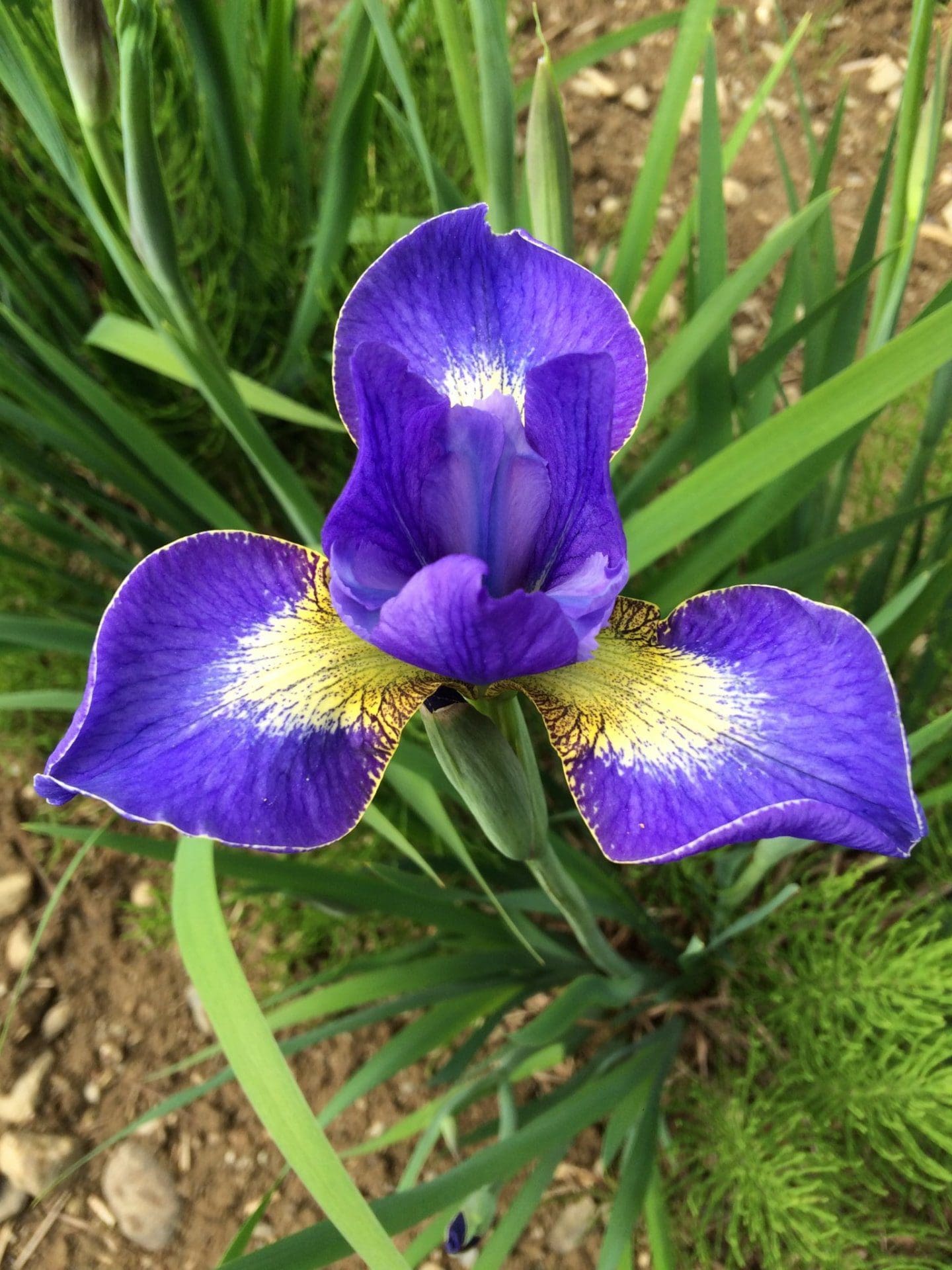 Bleu vif avec de larges sépales marqués d’une tache jaune éclatante qui se fond doucement dans le violet. Les pétales ondulés apportent une élégance naturelle à cette fleur au contraste saisissant.