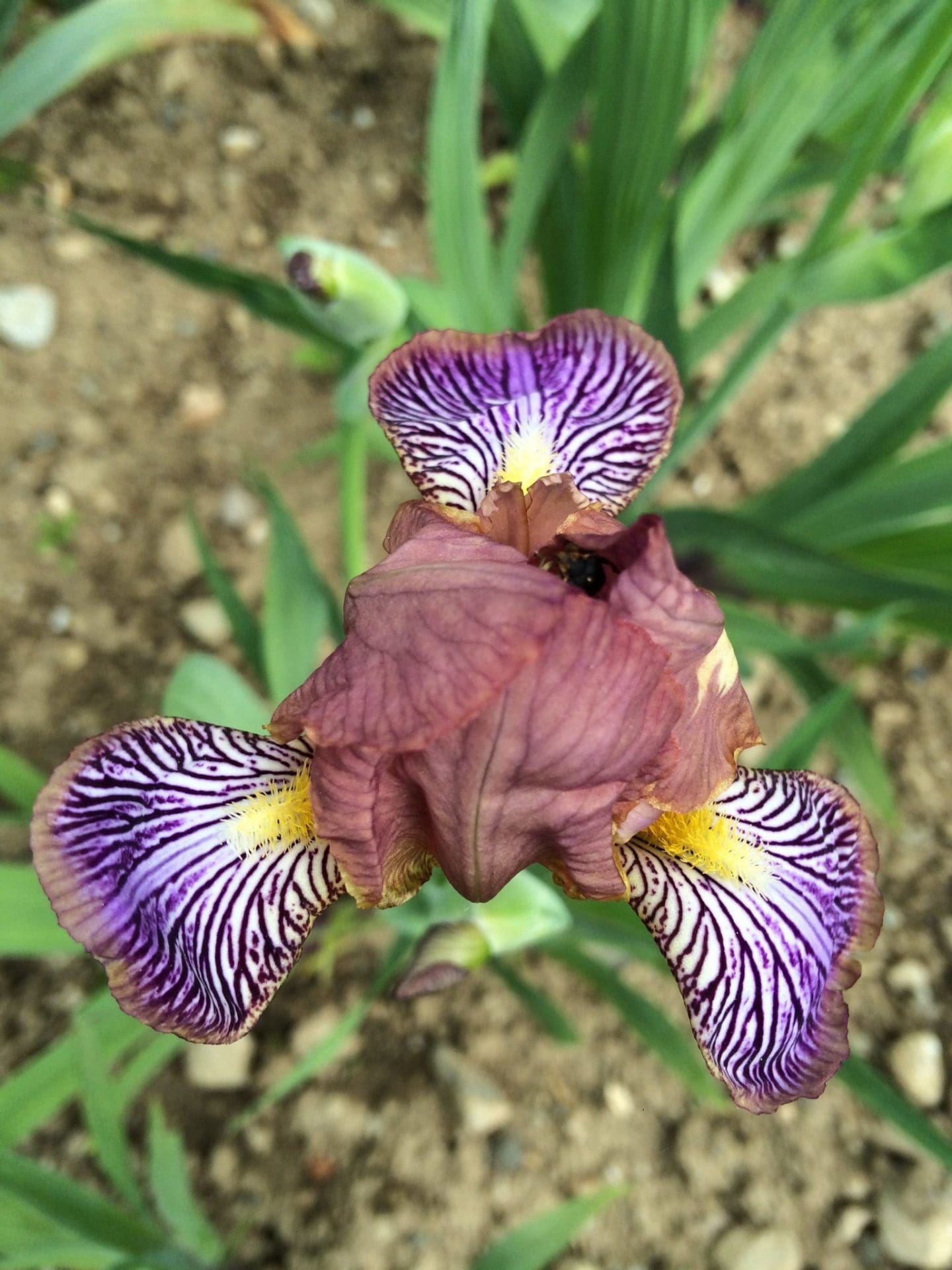 Entre taupe et mauve, les pétales se fondent avec subtilité tandis que les sépales dévoilent un labyrinthe violet sur fond clair. Un charme intrigant.