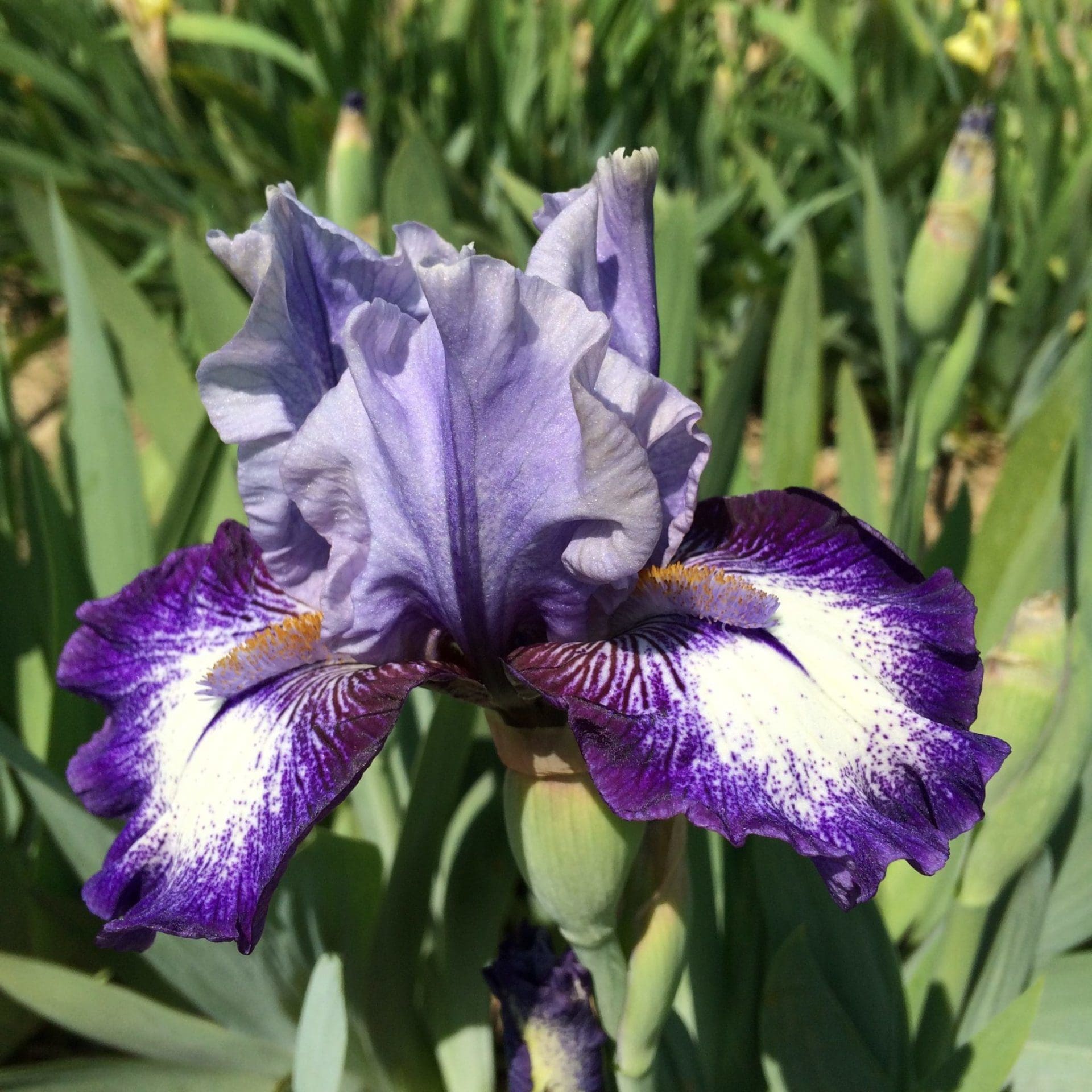 Iris Plicata aux pétales bleu glacé, contrastant magnifiquement avec des sépales blancs ourlés et mouchetés de violet. Une élégance fraîche et subtile, idéale pour apporter une touche de sérénité et fraîcheur au jardin.