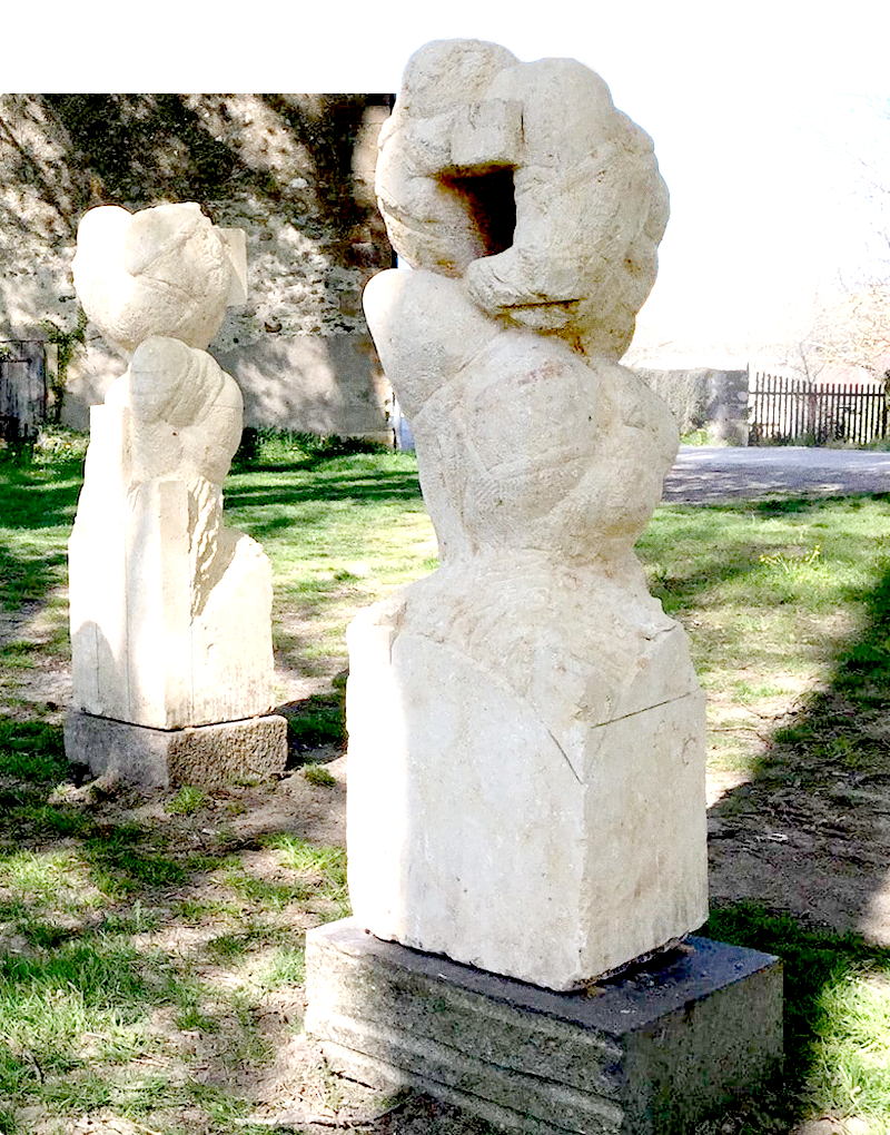 Dans les jardins de Vullierens, depuis 2015, au bord des anciennes douves et à l’ombre des tilleuls centenaires, trois figures de pierre incarnent l’amour, la force et la volupté. Éloignées des parterres fleuris, ces sculptures en grès coquillier — un couple de 2,50 m et deux figures de 1,70 m — semblent rêver dans la clarté chaleureuse de leur matière.