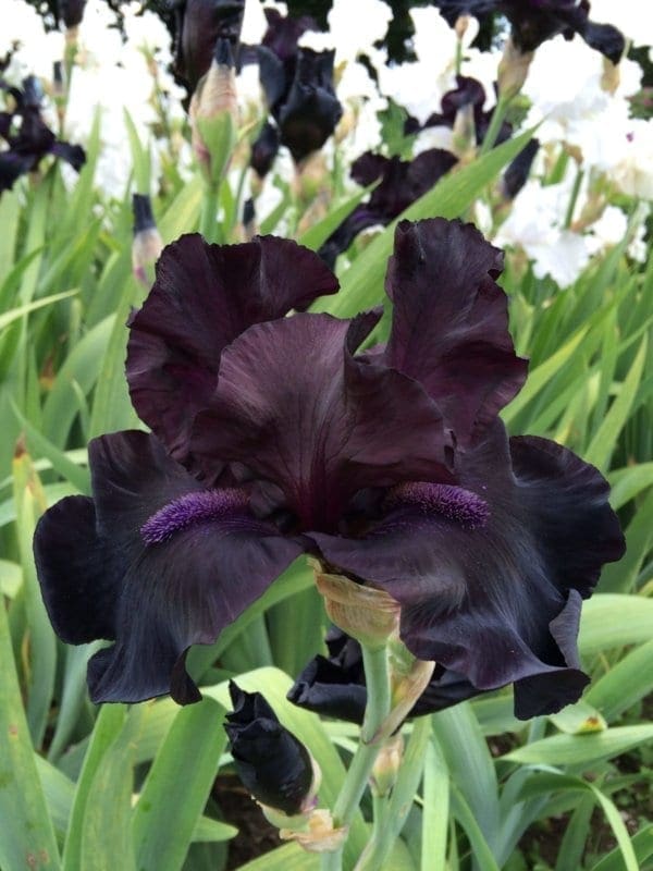 «Un noir» tout en douceur, aux pétales mats et sépales de velours. Légèrement ondulé. Barbes couleur raisin noir. Floraison mi-saison.