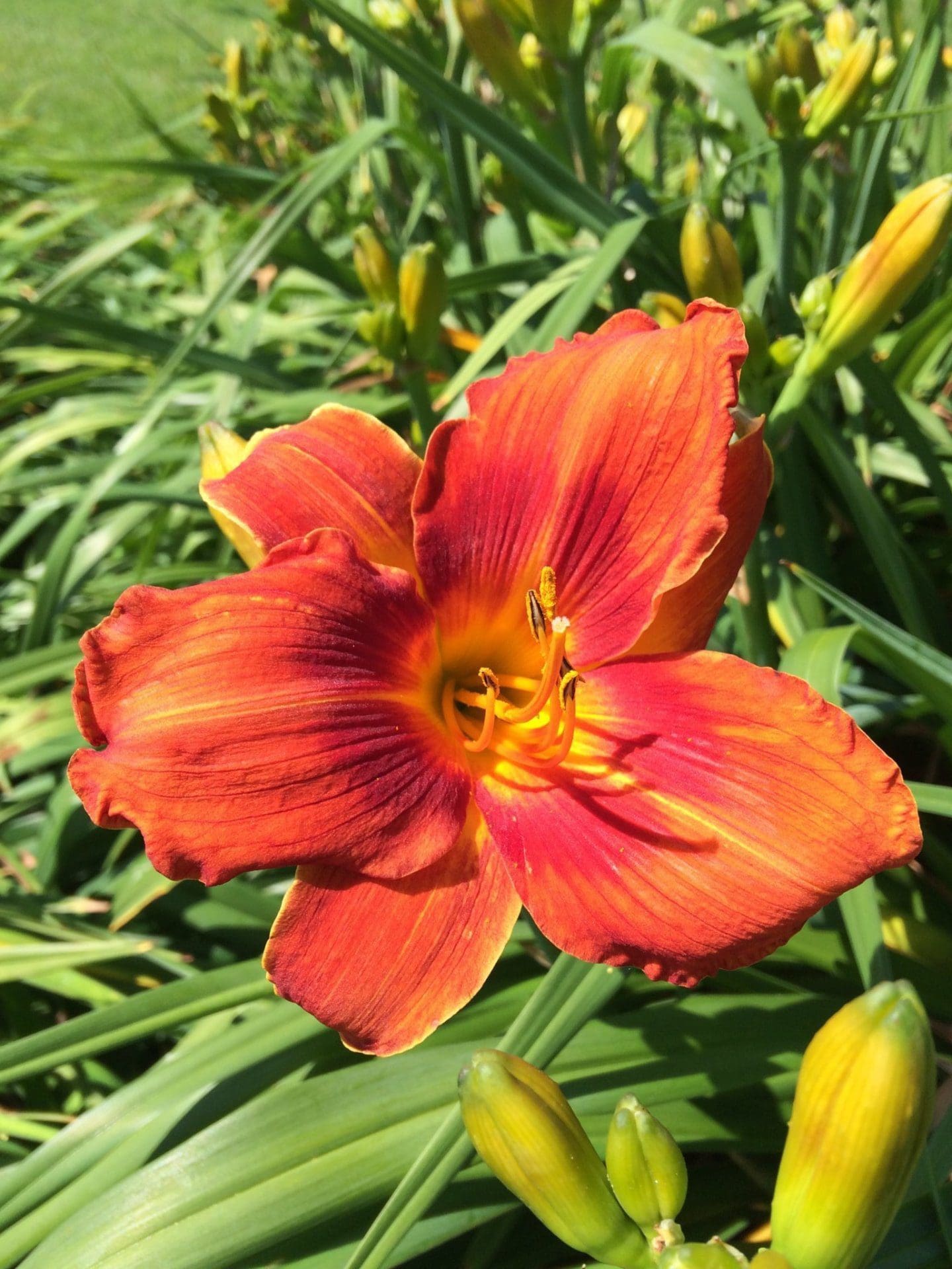 Grosse fleur rouge-orange vif avec un oeil acajou.