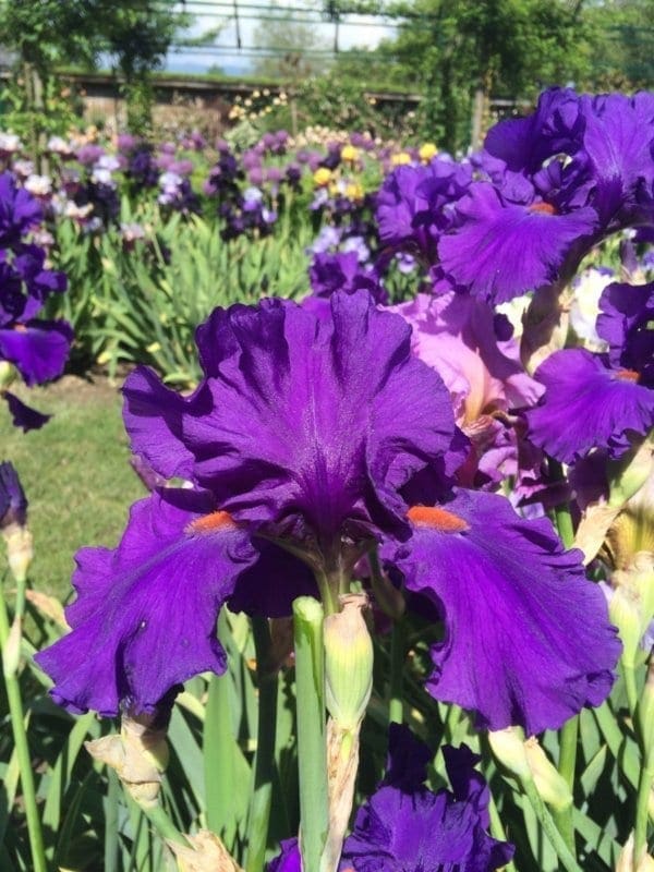 Large fleur d’un contraste saisissant parfaitement ondulée en violet foncé aux barbes orange soutenu. Iris haut sur tige et bien branchu. Floraison mi à fin-saison.
