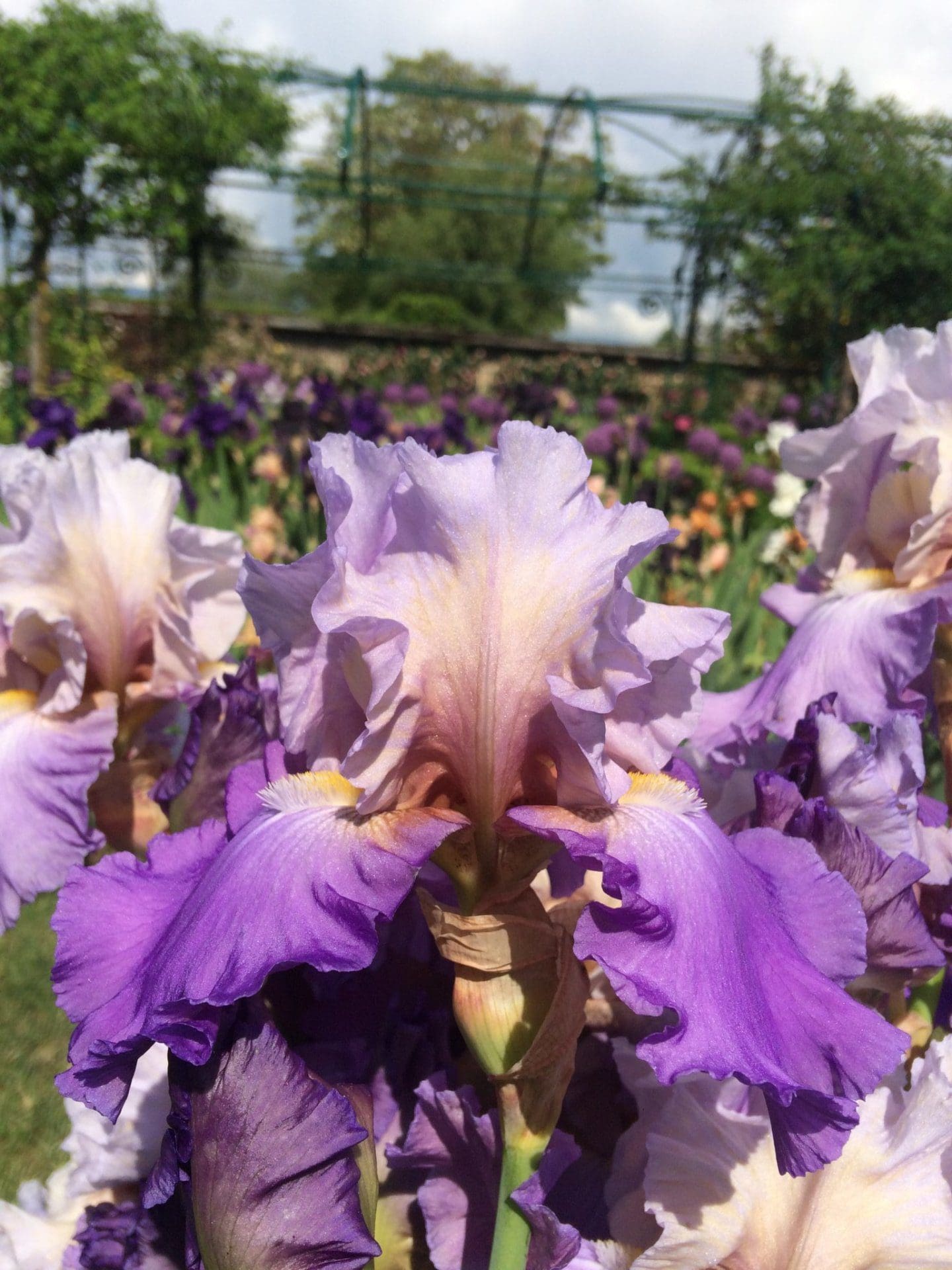 Pétales blanc nacré teintés de lavande à la base. Sépales lavande, plus clair au centre. Fleur ondulée sur longue tige solide et branchue. Iris remontant. Floraison début à mi-saison.