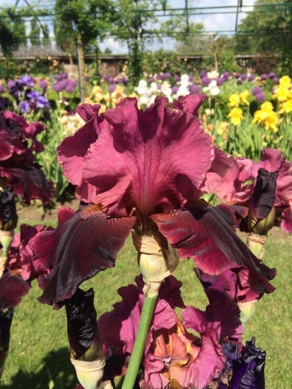 Les sépales bordeaux profonds complètent joliment les pétales rubis plus claires et les barbes harmonisantes. Les fleurs opulentes conservent leurs couleurs somptueuses même par mauvais temps. Prolifique, fleurit tardivement.