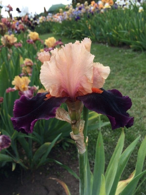 Joli iris dans les tons crème pêche pour le pétales et bordeaux sombre et velouté pour les sépales, faisant assez noir au soleil. L’ensemble de la fleur est joliment ondulé, belle barbe orange. Floraison début mi-saison.