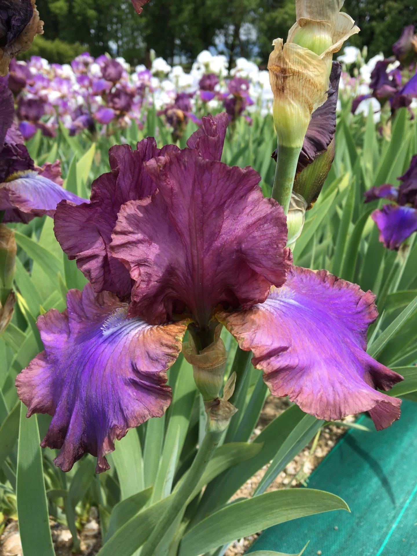 Enorme iris rose-violet bleuté au centre des sépales. Doux parfum de raisin. Iris remontant. Floraison mi-saison.